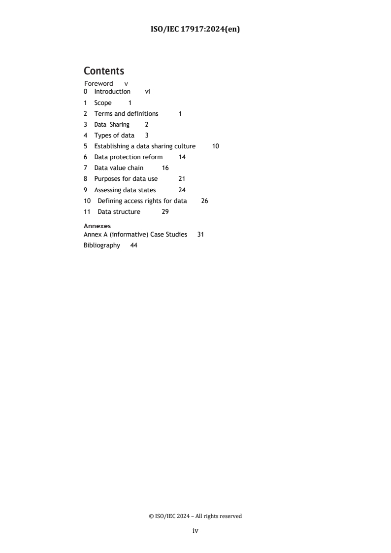 ISO/IEC 17917:2024 is a standard published by the International Organization for Standardization (ISO). Its full title is "Smart cities - Guidance to establishing a decision-making framework for sharing data and information services". This standard covers: This standard gives guidance on establishing a decision-making framework for sharing data and information services in smart cities. It covers: a) types of data in smart cities; b) establishing a data sharing culture; c) data value chain – roles and responsibilities; d) purposes for data use; e) assessing data states; f) defining access rights for data; and g) data formats/format of transportation. This standard aims to support the sharing of data and information services within cities. For some cities there will also be a need to establish specific data sharing agreements, particularly where data is being shared by multiple organizations at once. This standard supports a transparent approach to making decisions and creating specific data sharing agreements in order to fully realise the benefits and value of data and information services in a city. Missing data or misinterpretation of data can lead to the wrong actions being taken by city decision-makers. A decision-making framework for sharing data can help ensure that they have the best overall data on which to base decisions. This standard does not cover: a) national security issues; b) good practice for use of data by the citizen; c) existing interoperability agreements between cities; d) defining application programming interfaces (API) networks; or e) any data sharing rules and regulations specific to a particular jurisdiction. It is assumed that a security-minded approach to data sharing is used by cities. NOTE 1 Further details on the areas not covered in this standard, including information on relevant standards publications, are given in Annex A. This standard is for use by decision-makers in smart cities from the public, private and third sectors. It is also of interest to any city organization wishing to share data.