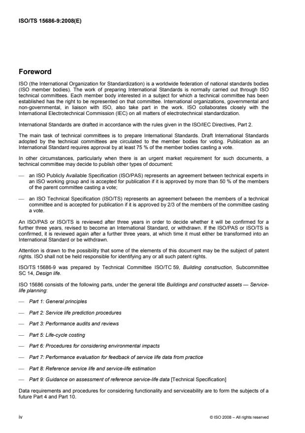 ISO/TS 15686-9:2008 is a technical specification published by the International Organization for Standardization (ISO). Its full title is "Buildings and constructed assets - Service-life planning - Part 9: Guidance on assessment of service-life data". This standard covers: ISO/TS 15686-9:2008 gives guidance for the derivation and presentation of reference service-life data. It is applicable to manufacturers or producers that provide reference service-life data for use in service-life planning in accordance with ISO 15686-1, ISO 15686-2, ISO 15686-3, ISO 15686-5, ISO 15686-6, ISO 15686-7 and ISO 15686-8.