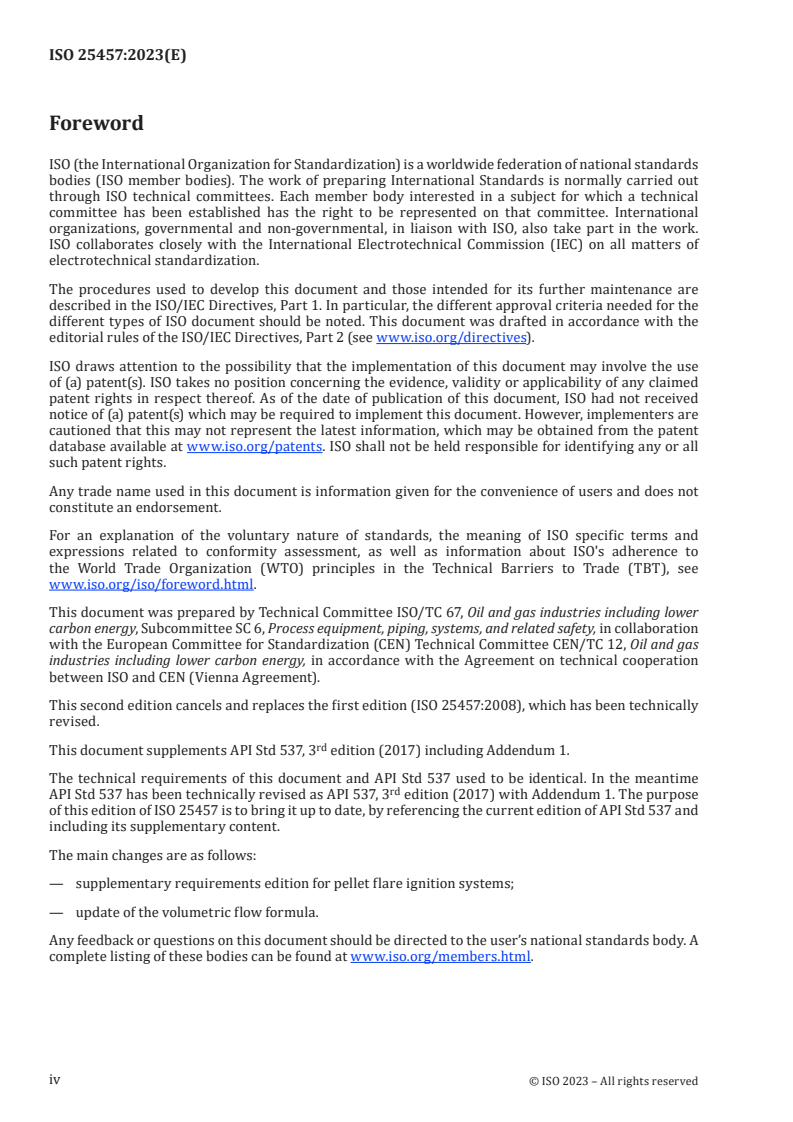 ISO 25457:2023 is a standard published by the International Organization for Standardization (ISO). Its full title is "Oil and gas industries including lower carbon energy - Flare details for general refinery and petrochemical service". This standard covers: This document specifies requirements and provides guidance for the selection, design, specification, operation, and maintenance of flares and related combustion and mechanical components used in pressure-relieving and vapor-depressurizing systems for petroleum, petrochemical, and natural gas industries. While this document is primarily intended for onshore facilities, guidance related to offshore applications is included. Guidance and best practices for the selection, specification, and mechanical details for flares and on the design, operation, and maintenance of flare combustion and related equipment is also provided. This document is a supplement to API 537, 3rd edition (2017) including Addendum 1, the requirements of which are applicable with the exceptions specified in this document.