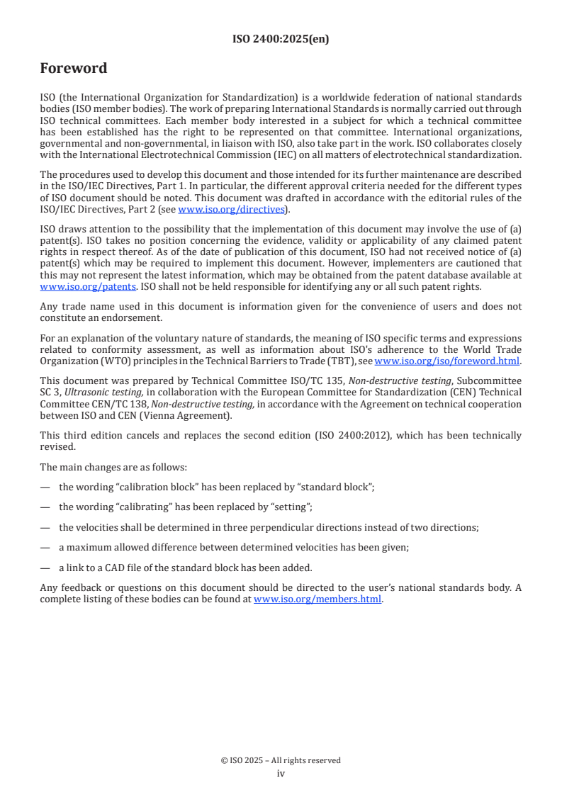 ISO 2400:2025 is a standard published by the International Organization for Standardization (ISO). Its full title is "Non-destructive testing - Ultrasonic testing - Specification for standard block No. 1". This standard covers: This document specifies the requirements for the dimensions, material and manufacture of a steel block for setting, checking and verification of ultrasonic test equipment used in manual testing.