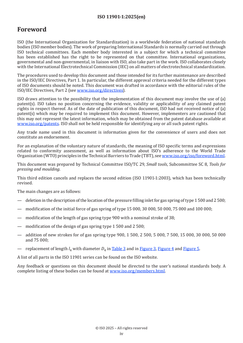 Keywords: ISO 11901-1:2025, gas springs standard, tools for pressing, press tools, nitrogen gas springs, nominal initial force, pressure filling inlet, marking, technical delivery conditions.