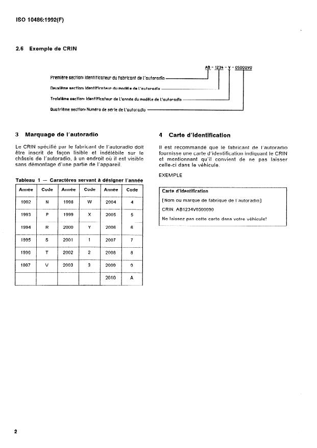 ISO 10486:1992 - Voitures particulieres -- Numéro d'identification des autoradios (CRIN)