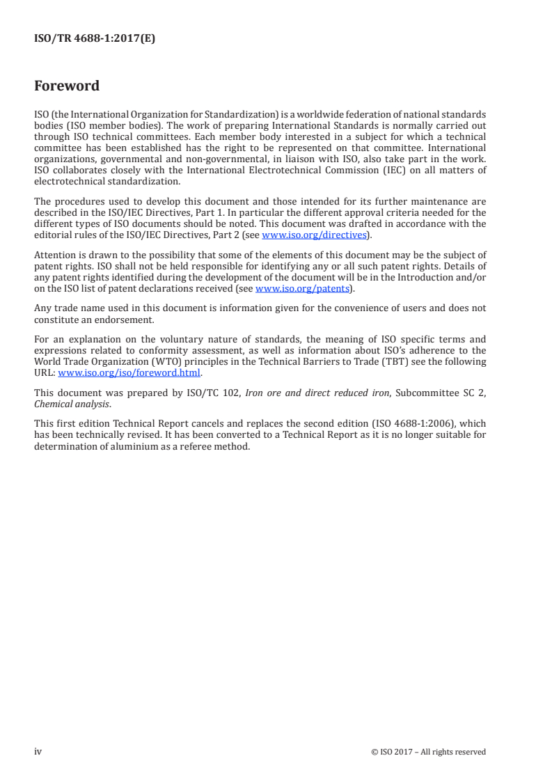 ISO/TR 4688-1:2017 - "Iron ores - Determination of aluminium - Part 1: Flame atomic absorption spectrometric method" specifies a laboratory procedure for determining the mass fraction of aluminium in iron ores, concentrates and agglomerates (including sinter). The method uses flame atomic absorption spectrometry (AAS) after chemical decomposition and is applicable to aluminium contents from 0.1 % to 5.0 % (mass fraction). This document is published as a Technical Report and replaces the earlier ISO 4688-1:2006 edition.