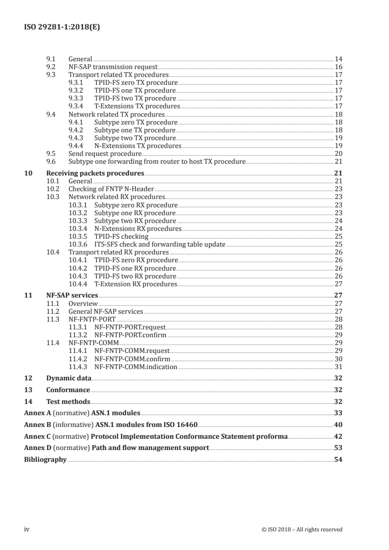 - Message formats (FNTP NPDU): N-Header, TPID-FS modes and FNTP body are specified; the standard references ISO/TS 16460 for basic message structures and ASN.1 module definitions (Annex A/B).