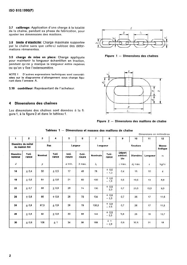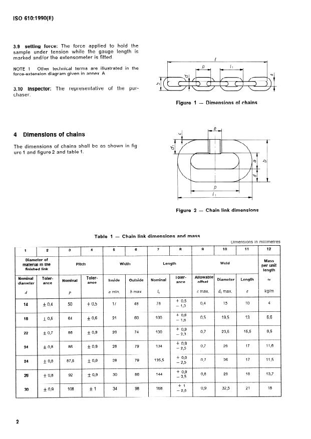 - Dimensions and tolerances: Detailed link geometry (pitch, inside/outside width, link length, weld dimensions) and permissible tolerances; matched-length requirements for short chain lengths.