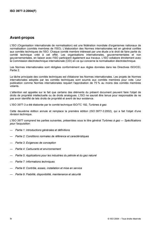 ISO 3977-3:2004 is a standard published by the International Organization for Standardization (ISO). Its full title is "Gas turbines - Procurement - Part 3: Design requirements". This standard covers: ISO 3977-3:2004 covers the design requirements for the procurement of all applications of gas turbines and gas turbine systems, including gas turbines for combined cycle systems and their auxiliaries, by a purchaser from a packager. It also provides assistance and technical information to be used in the procurement. It is not intended to deal with local or national legislative requirements with which the installation may be required to conform. ISO 3977-3:2004 is applicable to simple-cycle, combined-cycle and regenerative-cycle gas turbines working in open systems. It is not applicable to gas turbines used to propel aircraft, road construction and earth moving machines, agricultural and industrial types of tractors and road vehicles. In cases of gas turbines using special heat sources (for example, chemical process, nuclear reactors, furnace for a super-charged boiler), ISO 3977-3:2004 provides a basis.