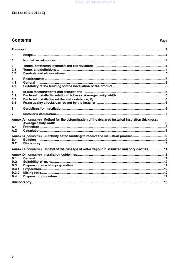 Ta evropski standard določa zahteve za proizvode iz brizgane poliuretanske pene (PUR) in poliizocianuratne pene (PIR), vgrajene v zidove z votlino. 2. del tega evropskega standarda je specifikacija nameščenega izolacijskega izdelka. 2. del tega evropskega standarda skupaj s 1. delom EN 14318 opisuje karakteristike izdelka, ki so povezane z osnovnimi zahtevami direktive o konstrukciji izdelkov. Določa tudi preverjanje in teste, ki naj se uporabljajo za deklaracije, ki jih ustvari monter izdelka. Ta evropski standard ne določa zahtevanih ravni vseh lastnosti, ki jih mora proizvod doseči, da se dokaže njegova primernost namenu za posamezno vrsto uporabe. Zahtevane ravni so določene v uredbah ali standardih, ki niso v nasprotju s tem standardom. Ta evropski standard ne zajema proizvodov iz trde poliuretanske pene (PUR) in poliizocianuratne pene (PIR) ali proizvodov, izdelanih na kraju samem, namenjenih za izolacijo opreme stavb in industrijskih inštalacij.
