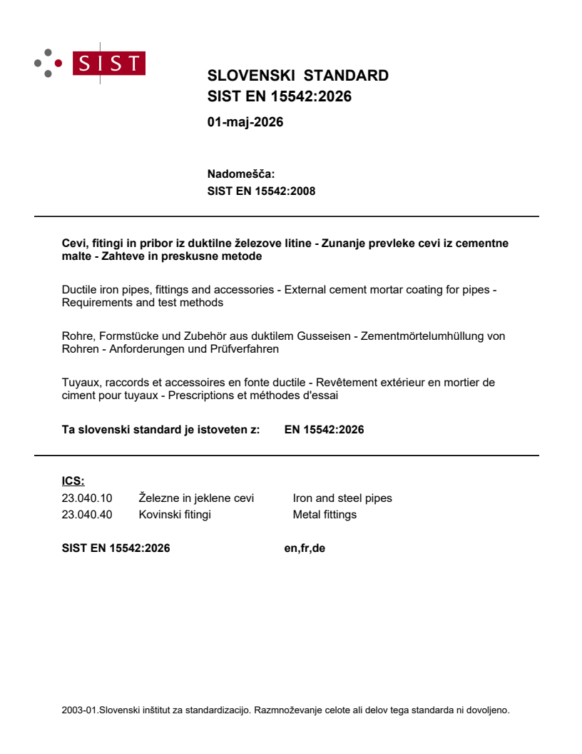 SIST EN 15542:2026 is a standard published by the Slovenian Institute for Standardization (SIST). Its full title is "Ductile iron pipes, fittings and accessories - External cement mortar coating for pipes - Requirements and test methods". This standard covers: This document specifies the requirements and test methods applicable to factory applied cement mortar coatings for the external corrosion protection of ductile iron pipes conforming to EN 545, EN 598 and EN 969 for use at operating temperatures up to 50 °C. Coatings according to this document are suitable for soils of all common corrosion loads and trenchless applications. Special activities on site such as joint protection, tapping, clamping, etc. could affect the corrosion protection properties of the cement mortar coating. These operations are normally covered in the laying instructions supplied by the manufacturers of pipes, clamps, house connection saddles, etc. and any relevant users' procedures. Such instructions are not part of this document.