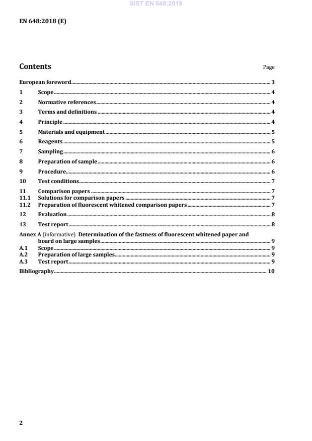 The document outlines methods to visually assess the resistance (fastness) of fluorescent whitening agents when paper or board materials are exposed to various test fluids under controlled conditions. SIST EN 648:2019 supersedes the previous 2006 version with updated scope, testing fluids, and definitions to better align with contemporary food contact situations.