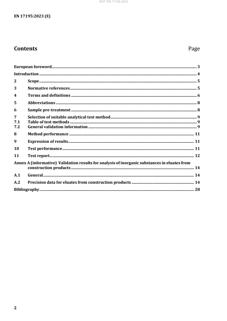 Ta evropski standard določa analitične metode za določanje glavnih in stranskih elementov in elementov v sledovih in anionov v vodnih izlužkih iz gradbenih proizvodov. Sklicuje se na naslednjih 67 elementov: