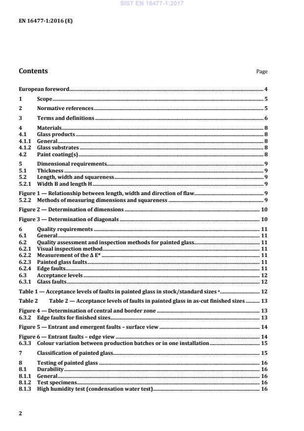 Table 2 — Acceptance levels of faults in painted glass in as-cut finished sizes . 13 Figure 4 — Determination of central and border zone . 13 6.3.2 Edge faults for finished sizes . 13 Figure 5 — Entrant and emergent faults – surface view . 14 Figure 6 — Entrant faults – edge view . 14 6.3.3 Colour variation between production batches or in one installation . 15 7 Classification of painted glass . 15 8 Testing of painted glass . 16 8.1 Durability . 16 8.1.1 General . 16 8.1.2 Test specimens . 16 8.1.3 High humidity test (condensation water test) . 16 SIST EN 16477-1:2017