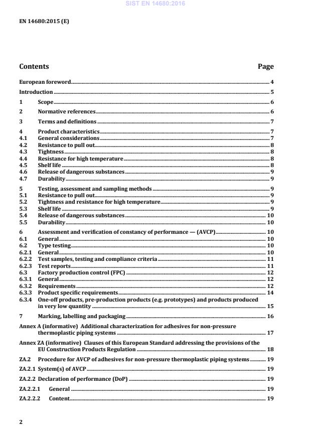 Clauses of this European Standard addressing the provisions of the EU Construction Products Regulation . 18 ZA.2 Procedure for AVCP of adhesives for non-pressure thermoplastic piping systems . 19 ZA.2.1 System(s) of AVCP . 19 ZA.2.2 Declaration of performance (DoP) . 19 ZA.2.2.1 General . 19 ZA.2.2.2 Content. 19 SIST EN 14680:2016