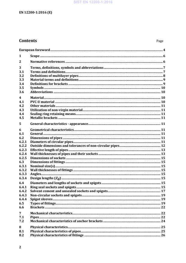 Page European foreword . 4 1 Scope . 6 2 Normative references . 6 3 Terms, definitions, symbols and abbreviations . 7 3.1 Terms and definitions . 7 3.2 Definitions of multilayer pipes . 8 3.3 Material terms and definitions . 9 3.4 Definitions for brackets . 9 3.5 Symbols . 10 3.6 Abbreviations . 10 4 Material . 10 4.1 PVC-U material . 10 4.2 Other materials . 11 4.3 Utilization of non-virgin material . 11 4.4 Sealing ring retaining means. 11 4.5 Metallic brackets . 11 5 General characteristics - appearance. 11 6 Geometrical characteristics . 11 6.1 General . 11 6.2 Dimensions of pipes . 11 6.2.1 Diameters of circular pipes . 11 6.2.2 Outside dimensions and tolerances of non-circular pipes . 12 6.2.3 Effective length of pipes . 13 6.2.4 Wall thicknesses of pipes and their sockets . 13 6.2.5 Dimensions of sockets . 15 6.3 Dimensions of fittings . 15 6.3.1 Nominal size(s) . 15 6.3.2 Wall thicknesses of fittings . 15 6.3.3 Angles. 15 6.3.4 Design lengths (Zd) . 15 6.4 Diameters and lengths of sockets and spigots . 15 6.4.1 Ring seal sockets and spigots . 15 6.4.2 Solvent cement and unsealed sockets and spigots . 17 6.4.3 Non-circular sockets and spigots . 19 6.4.4 Spigot sleeves . 19 6.5 Types of fittings . 19 6.6 Brackets . 22 7 Mechanical characteristics . 22 7.1 Pipes . 22 7.2 Mechanical characteristics of anchor brackets . 24 8 Physical characteristics . 25 8.1 Physical characteristics of pipes . 25 8.2 Physical characteristics of fittings . 26 SIST EN 12200-1:2016