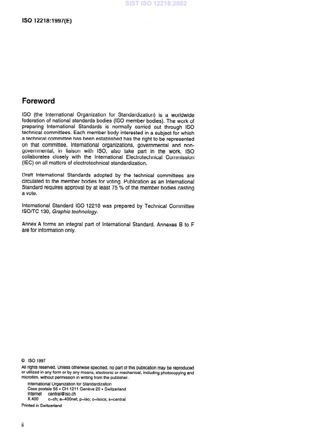 SIST ISO 12218:2002 is a standard published by the Slovenian Institute for Standardization (SIST). Its full title is "Graphic technology -- Process control -- Offset platemaking". This standard covers: Graphic technology -- Process control -- Offset platemaking