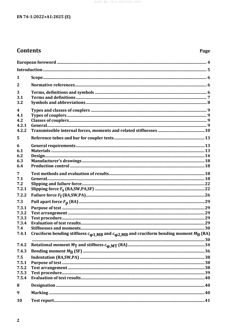 Ta dokument za pravokotne spojke, vrtljive spojke, objemne spojke in vzporedne spojke, ki delujejo na osnovi trenja, določa: materiale; – zahteve za projektiranje; – trdnostne razrede z različnimi strukturnimi parametri, vključno z vrednostmi za odpornost in togost; – preskusne postopke; – ocenjevanje; ter podaja: – priporočila za nadzor proizvodnje v teku. Te spojke so namenjene uporabi v opremi za začasne gradnje, npr. gradbene odre, postavljene v skladu s standardom EN 12811-1, in nosilne odre, postavljene v skladu s standardom EN 12812.