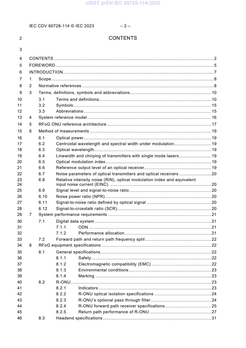 prEN IEC 60728-114:2023 defines requirements and test methods for optical transmission systems using RFoG (RF over Glass) technology. Produced by IEC TA5 and published in parallel with CENELEC processes, this draft standard covers system reference models, RFoG ONU (R-ONU) architecture, measurement methods, performance allocation and equipment specifications for headend and customer-premises optical components. It also provides informative annexes on implementation, system loss, optical beat interference (OBI), outdoor housings and effects of off‑state optical power.