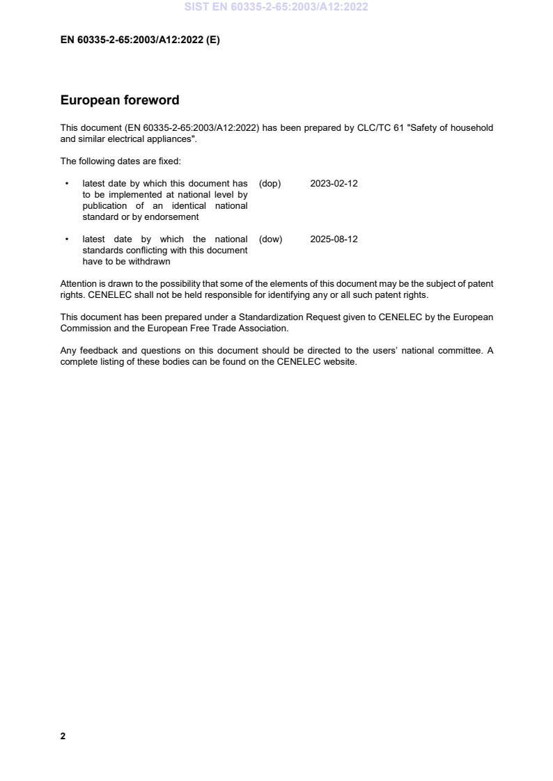 This amendment A12 modifies the European Standard EN 60335-2-65:2003; it was approved by CENELEC on 2021-10-11. CENELEC