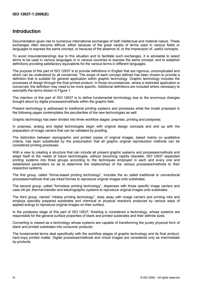 ISO 12637-1:2006 defines a set of fundamental terms that can be used in the drafting of other International Standards for graphic technology. In order to facilitate their translation into other languages, the definitions are worded so as to avoid, where possible, any peculiarity attached to one language. The entries in ISO 12637-1:2006 are arranged alphabetically.