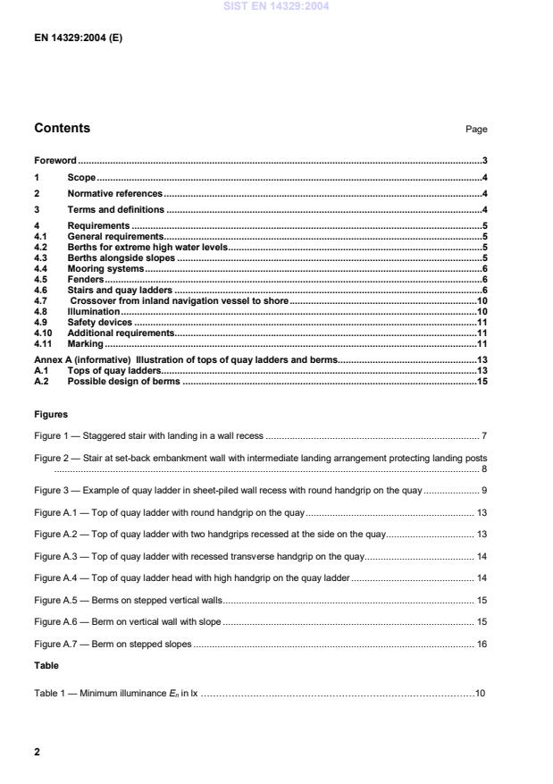 Figures Figure 1 — Staggered stair with landing in a wall recess.7 Figure 2 — Stair at set-back embankment wall with intermediate landing arrangement protecting landing posts.8 Figure 3 — Example of quay ladder in sheet-piled wall recess with round handgrip on the quay.9 Figure A.1 — Top of quay ladder with round handgrip on the quay.13 Figure A.2 — Top of quay ladder with two handgrips recessed at the side on the quay.13 Figure A.3 — Top of quay ladder with recessed transverse handgrip on the quay.14 Figure A.4 — Top of quay ladder head with high handgrip on the quay ladder.14 Figure A.5 — Berms on stepped vertical walls.15 Figure A.6 — Berm on vertical wall with slope.15 Figure A.7 — Berm on stepped slopes.16 Table Table 1 — Minimum illuminance En in lx …………………….………………………………………………………10