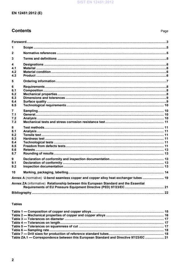 Relationship between this European Standard and the Essential Requirements of EU Pressure Equipment Directive (PED) 97/23/EC . 21Bibliography . 22 Tables Table 1 — Composition of copper and copper alloys . 15 Table 2 — Mechanical properties of copper and copper alloys . 16 Table 3 — Tolerances on diameter . 17 Table 4 — Tolerances on length . 17 Table 5 — Tolerances on squareness of cut . 17 Table 6 — Sampling rate . 18 Table 7 — Drill sizes for production of reference standard tubes . 18 Table ZA.1 — Correspondence between this European Standard and Directive 97/23/EC . 21