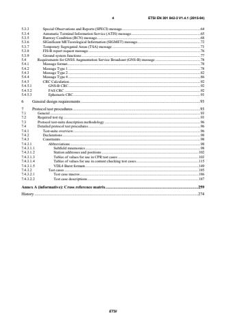 ETSI EN 301 842-1 [2] obravnava preskuse fizične plasti. Standard ETSI EN 301 842-2 [3] zajema preskuse plasti povezav, ki zadostujejo za podporo radiodifuzijskih funkcij, vključno z zahtevami in preskusi, ki zadostujejo za prepoznavanje in odgovarjanje na prenose, povezane s komunikacijo točka-točka. Ta dokument vsebuje tehnične specifikacije za talni oddajnik-sprejemnik VDL, 4. način, ki podpira polni avtomatski odvisni nadzor – difuzija (ADS-B) in izbirno dodatne funkcije ene storitve ali kombinacije naslednjih storitev: