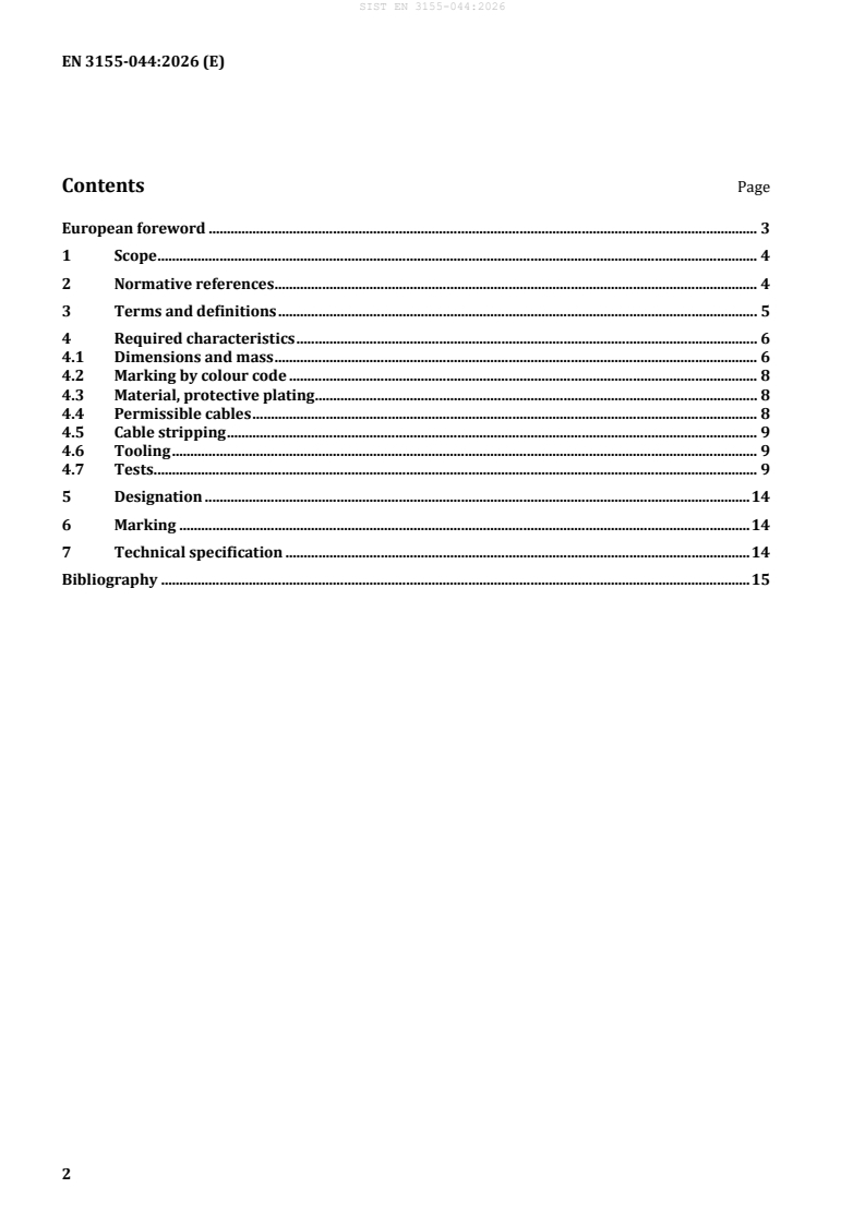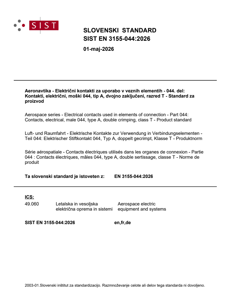 SIST EN 3155-044:2026 is a standard published by the Slovenian Institute for Standardization (SIST). Its full title is "Aerospace series - Electrical contacts used in elements of connection - Part 044: Contacts, electrical, male 044, type A, double crimping, class T - Product standard". This standard covers: This document specifies the required characteristics, tests and tooling applicable to electrical contacts, male 044, type A, double crimping, class T, used in elements of connection according to EN 3155 002. It is used together with EN 3155 001. The associated female contacts are specified in EN 3155 045.
