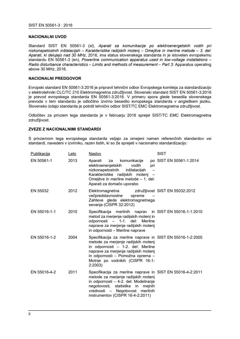 SIST EN 50561-3:2016 is a standard published by the Slovenian Institute for Standardization (SIST). Its full title is "Powerline communication apparatus used in low-voltage installations – Radio disturbance characteristics – Limits and methods of measurement – Part 3: Apparatus operating above 30 MHz". This standard covers: This part of EN 50561 specifies limits and methods of measurement of radio disturbance characteristics for in-home communication apparatus that use the low voltage power installation as the transmission medium. This part of EN 50561 applies to equipment that uses frequencies including those above 30 MHz in order to communicate. Procedures are given for the measurement of signals generated by the equipment and limits are specified within the frequency range 9 kHz to 400 GHz. No measurement is required at frequencies where no limits are specified. The radiated emission requirements in this standard are not intended to be applicable to the intentional transmissions from a radio-transmitter as defined by the ITU, nor to any spurious emissions related to these intentional transmissions. NOTE The requirements defined in this standard effectively restrict the intended transmission frequencies to below 87,5 MHz.