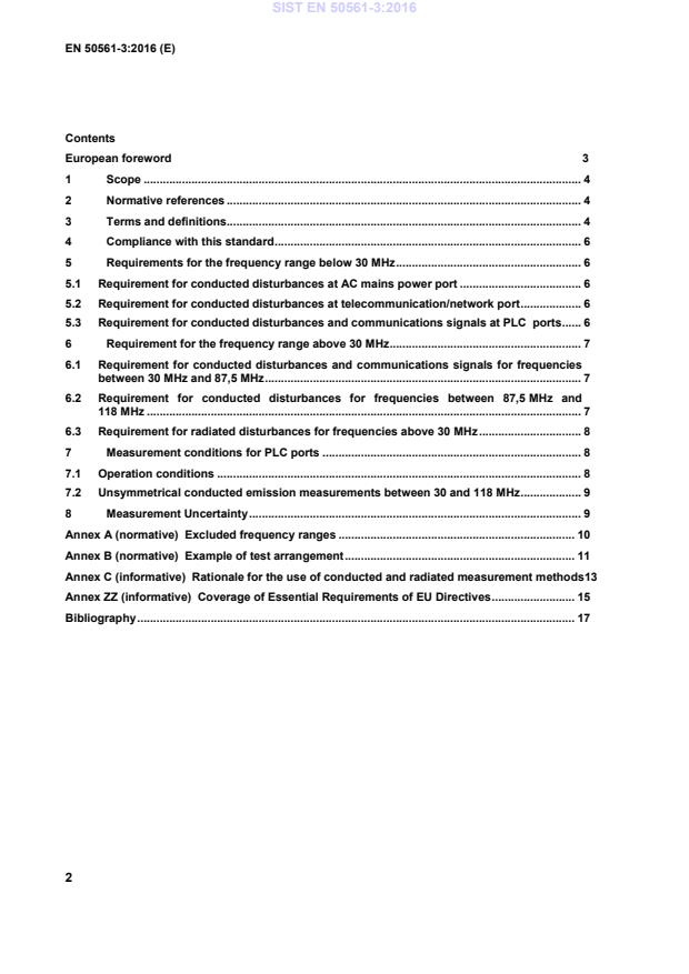 Contents European foreword 3 1 Scope . 4 2 Normative references . 4 3 Terms and definitions. 4 4 Compliance with this standard . 6 5 Requirements for the frequency range below 30 MHz . 6 5.1 Requirement for conducted disturbances at AC mains power port . 6 5.2 Requirement for conducted disturbances at telecommunication/network port . 6 5.3 Requirement for conducted disturbances and communications signals at PLC