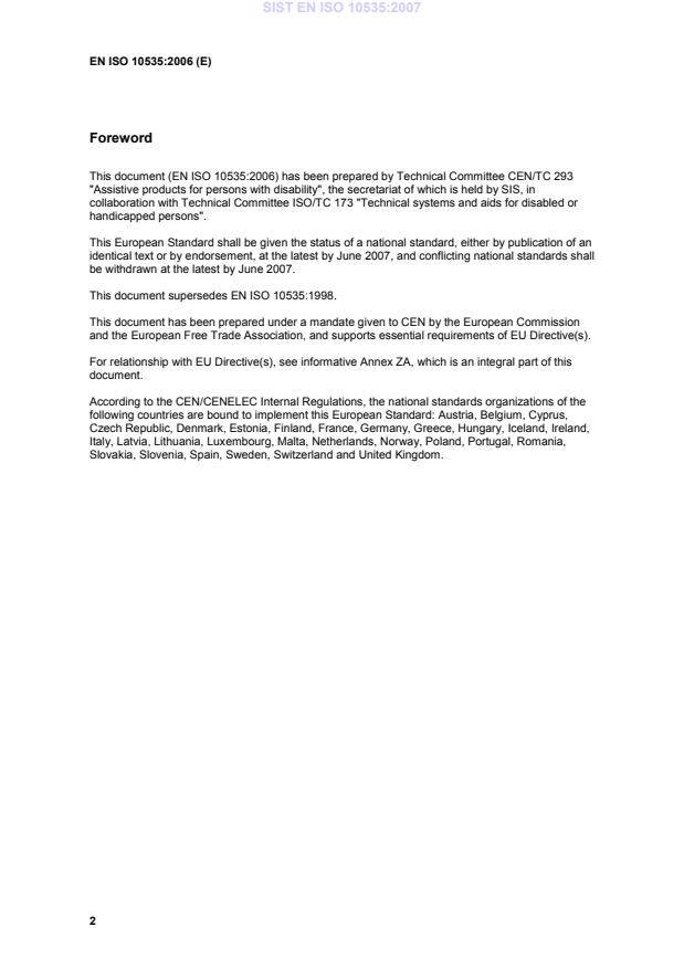 This document (EN ISO 10535:2006) has been prepared by Technical Committee CEN/TC 293 "Assistive products for persons with disability", the secretariat of which is held by SIS, in collaboration with Technical Committee ISO/TC 173 "Technical systems and aids for disabled or handicapped persons".