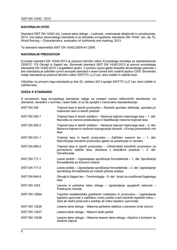 The SIST EN 14342:2013 standard defines and specifies the relevant characteristics and requirements of flat surface wood flooring products and parquets, illustrating its comprehensive scope within the category of wood flooring. This European Standard is particularly notable for its inclusion of widely recognized products such as solid parquet elements, multi-layer parquet elements, and wood veneer floor coverings, ensuring that a broad spectrum of wood flooring is encompassed and evaluated for conformity. A significant strength of this standard lies in its detailed classification of various wood flooring types, allowing for clear identification and understanding of dimensional tolerances and product definitions. By referencing specific related European standards, such as EN 13226 for solid parquet elements and EN 13489 for multi-layer parquet elements, the SIST EN 14342:2013 enhances clarity and facilitates industry compliance. Furthermore, it addresses the essential aspect of conformity evaluation, which is crucial for manufacturers and suppliers aiming to meet regulatory requirements. The standard's relevance is underscored by its application to wood flooring products that improve their reaction to fire performance and durability against biological agents. This aspect is particularly significant in contemporary construction practices that prioritize safety and longevity, making the standard applicable to modern design and usability standards in internal flooring systems, including fully enclosed public transport premises. However, the scope is definitive, as it explicitly states exclusions for products like bamboo flooring and laminate flooring. This focused applicability ensures that stakeholders are well-informed about which products the standard governs, thereby avoiding confusion in compliance and evaluation processes. In summary, SIST EN 14342:2013 is a robust standard that sets forth a clear framework for the evaluation and marking of wood flooring products and parquets. It effectively balances comprehensive coverage of necessary specifications while pinpointing essential exclusions, underscoring its practicality and utility in the wood flooring industry.