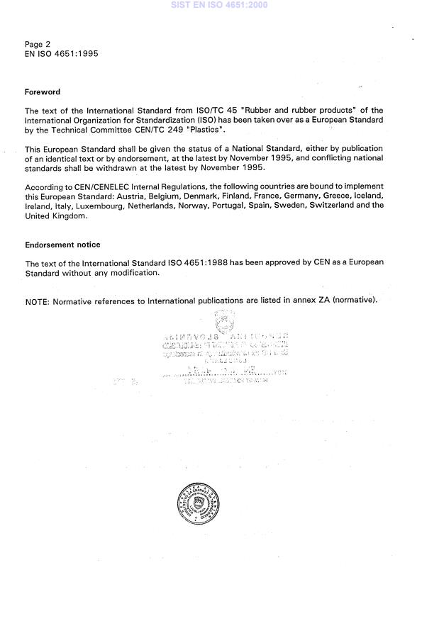 ISO 4651 : 1988 (El Foreword ISO (the International Organization for Standardization) is a worldwide federation of national Standards bodies (ISO member bodies). The work of preparing International Standards is normally carried out through ISO technical committees. Esch member body interested in a subject for which a technical committee has been established has the right to be represented on that committee. International organizations, govern- mental and non-governmental, in liaison with ISO, also take part in the work. ISO collaborates closely with the International Electrotechnical Commission (IEC) on all matters of electrotechnical standardization. Draft International Standards adopted by the technical committees are circulated to the member bodies for approval before their acceptance as International Standards by the ISO Council. They are approved in accordance with ISO procedures requiring at least 75 % approval by the member bodies voting. International Standard ISO 4651 was prepared by Technical Committee ISO/TC 45, Rubber and rubber products. This second edition cancels and replaces the first edition (ISO 4651 : 1979), sub-clauses 3.1, 7.1, 7.2.1, 7.2.2, 8.2 and 9.2 of which have been technically revised. Annex A of this International Standard is for information only. 0 International Organkation for Standardkation, 1988 Printed in Switzerland SIST EN ISO 4651:2000