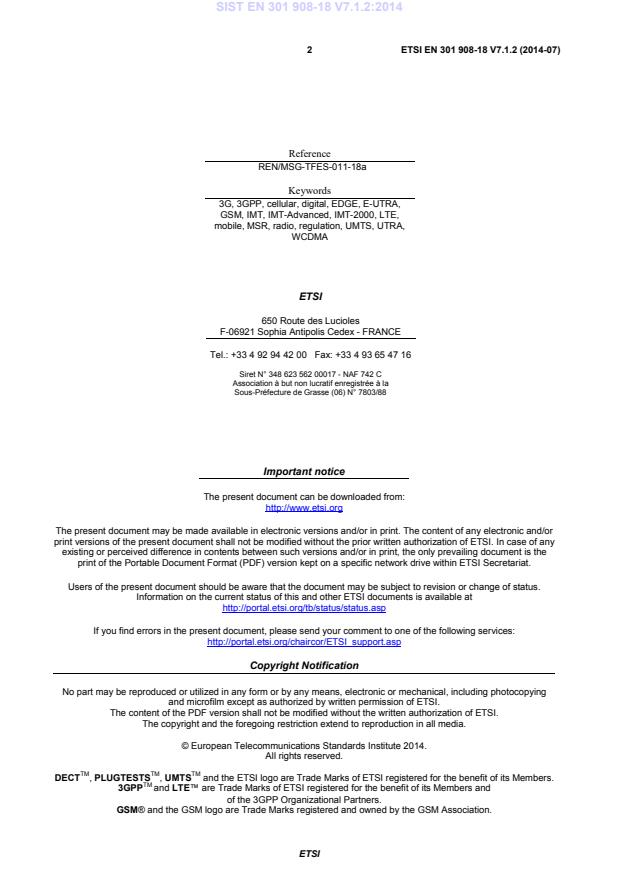 ETSI ETSI EN 301 908-18 V7.1.2 (2014-07)6fntellectual=mroéerty=oights=IPRs essential or potentially essential to the present document may have been declared to ETSI. The information pertaining to these essential IPRs, if any, is publicly available for ETSI members and non-members, and can be found in ETSI SR 000 314: "Intellectual Property Rights (IPRs); Essential, or potentially Essential, IPRs notified to ETSI in respect of ETSI standards", which is available from the ETSI Secretariat. Latest updates are available on the ETSI Web server (http://ipr.etsi.org). Pursuant to the ETSI IPR Policy, no investigation, including IPR searches, has been carried out by ETSI. No guarantee can be given as to the existence of other IPRs not referenced in ETSI SR 000 314 (or the updates on the ETSI Web server) which are, or may be, or may become, essential to the present document. coreword=This Harmonized European Standard (EN) has been produced by ETSI Technical Committee Mobile Standards Group (MSG). The present document has been produced by ETSI in response to mandate M/284 issued from the European Commission under Directive 98/34/EC [i.1] as amended by Directive 98/48/EC [i.6]. The title and reference to the present document are intended to be included in the publication in the Official Journal of the European Union of titles and references of Harmonized Standard under the Directive 1999/5/EC [i.2]. See article 5.1 of Directive 1999/5/EC [i.2] for information on presumption of conformity and Harmonized Standards or parts thereof the references of which have been published in the Official Journal of the European Union. The requirements relevant to Directive 1999/5/EC [i.2] are summarized in annex A. The present document is part 18 of a multi-part deliverable. Full details of the entire series can be found in part 1 [i.7].