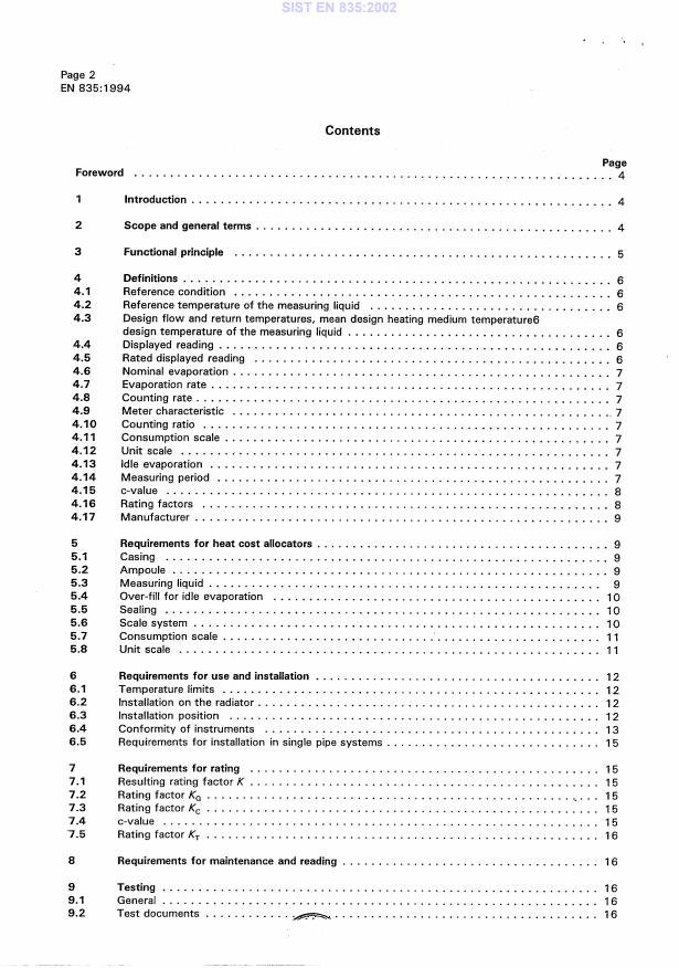 EN 835:1994 (CEN) specifies requirements for heat cost allocators that determine the consumption of room heating radiators using the evaporation principle. These devices are appliances without an electrical energy supply and are intended to register the heat output of radiators in consumer units served by a common central or district heating system. A complete grouping of consumer units supplied together is termed an account unit. ICS classification: 91.140.10 (Central heating systems).