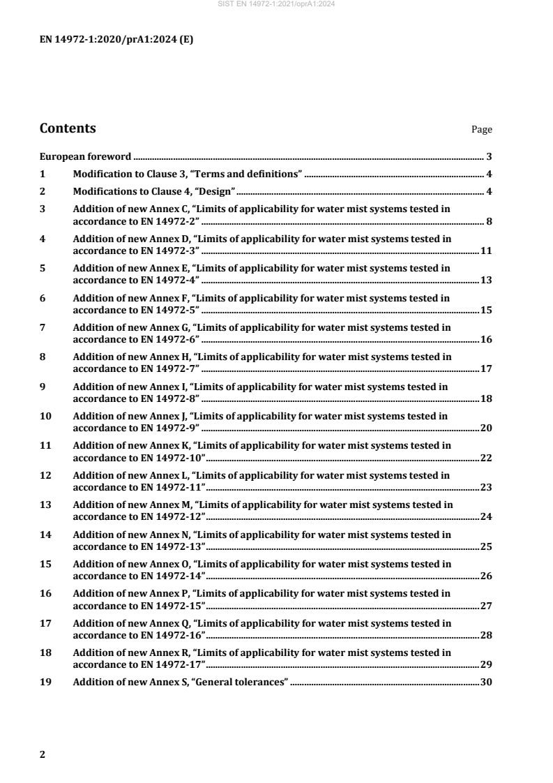 The amendment introduces multiple annexes (C through R) detailing the limits of applicability for water mist systems tested according to individual parts of the EN 14972 series, allowing for precise adaptation to various fire safety needs and environments.