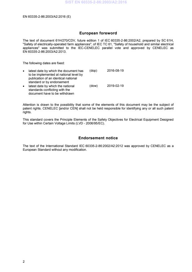 This amendment A2 modifies the European Standard EN 60335-2-86:2003; it was approved by CENELEC on 2012-11-29. CENELEC
