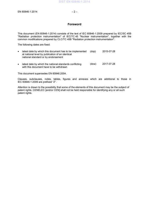 EN 60846-1:2014 (CLC) is the European adoption, with common modifications, of IEC 60846-1:2009. It defines design requirements and performance characteristics for portable dose equivalent (rate) meters and monitors used to determine ambient dose equivalent (H(10))* and directional dose equivalent (H'(0.07) or H'(3)) from external beta, X and gamma radiation, referencing ICRU Report 47. The standard targets portable workplace and environmental instruments used in radiation protection and supersedes EN 60846:2004.