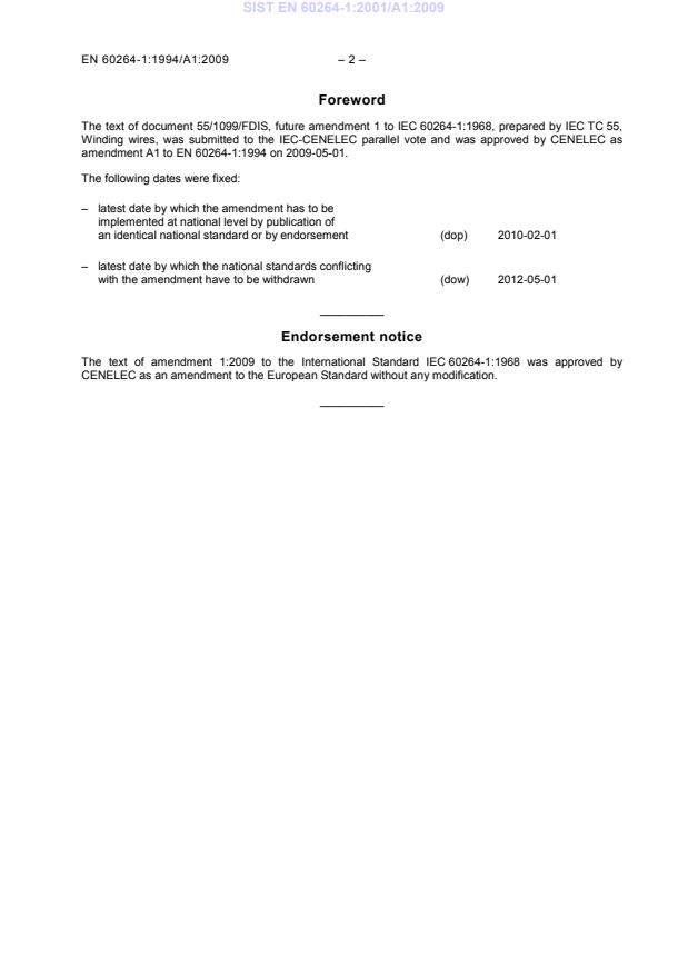 This amendment (A1) was approved on 2009-05-01 and updates the base EN 60264-1:1994 text (including replacement of Table 2 with additional nominal sizes and tolerances expressed in millimetres).