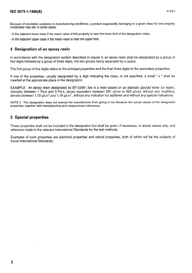 Contains a method of designation for epoxy resins. The objective of this method is to allocate to each commercial product a group of digits, giving in a coded form certain information on the product such as chemical base, main properties and the nature of modifiers, solvents or additives. Replaces the first edition.
