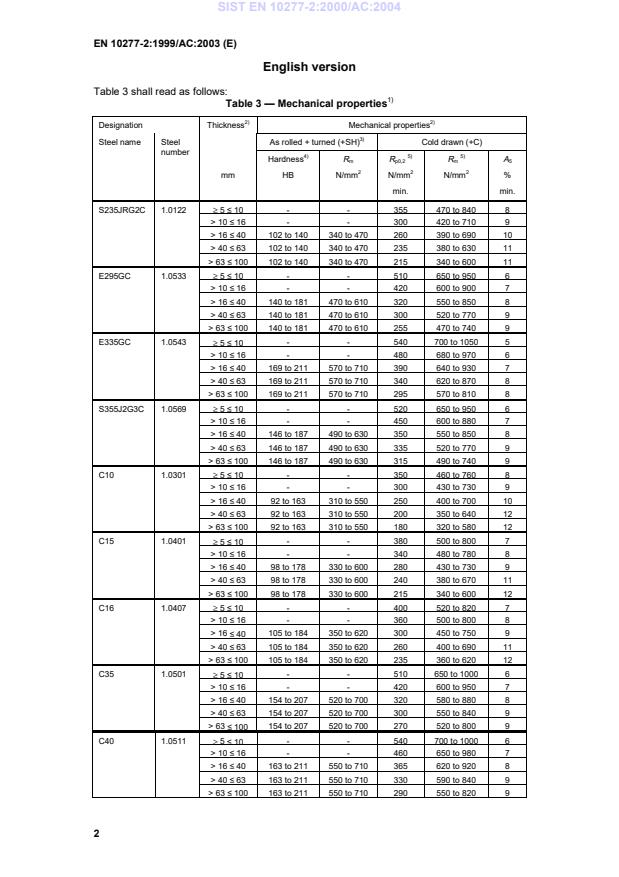 記事のタイトル:SIST EN 10277-2:2000/AC:2004 - 明るい鋼材製品-技術的な納品条件- Part 2:一般工学用鋼材 記事の内容: TC-テーブル3の置き換え この記事は、特に一般工学用途のための鋼材に関する明るい鋼材製品の技術的な納品条件に焦点を当てています。記事の中心は、テーブル3の置き換えです。