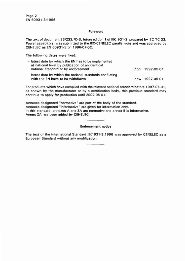 EN 60931-3:1996 (CLC adoption of IEC 931-3:1996) specifies requirements and test methods for internal fuses fitted to shunt power capacitors of the non‑self‑healing type for a.c. systems with rated voltage up to and including 1 kV. The standard addresses fuse design, performance, routine and type testing, and gives guidance for coordinating fuse protection in capacitor units and banks. It clarifies that internal fuses are intended to isolate faulty capacitor elements to allow continued operation of the remaining unit or bank and are not a substitute for circuit‑breakers or external protection.