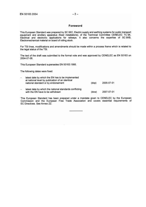 Ta evropski standard določa glavne značilnosti napajalnih napetosti sistemov električne vleke, npr. nepremičnih naprav za vleko, vključno s pomožnimi napravami, ki se napajajo prek kontaktnega vodnika, in železniških vozil, za: – železnice; – vodene sisteme javnega prevoza, kot so tramvaji, dvignjene in podzemne železnice, gorske železnice in trolejbusni sistemi; – sisteme za prevoz materiala. Ta evropski standard se ne uporablja za – vlečne sisteme za podzemne rudnike, – žerjave, prestavljive ploščadi in podobno prevozno opremo na tirih, začasne konstrukcije (npr. razstavne konstrukcije), pod pogojem, da se ne napajajo neposredno ali prek transformatorjev iz sistema kontaktnega vodnika ter jih ne ogroža vlečni napajalni sistem, – obešene nihalne žičnice, – tirne vzpenjače.