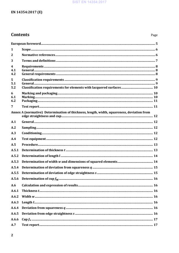 Determination of thickness, length, width, squareness, deviation from edge straightness and cup . 12 A.1 General . 12 A.2 Sampling . 12 A.3 Conditioning . 12 A.4 Test equipment . 12 A.5 Procedure. 13 A.5.1 Determination of thickness t . 13 A.5.2 Determination of length l . 14 A.5.3 Determination of width w and dimensions of squared elements . 14 A.5.4 Determination of deviation from squareness q . 15 A.5.5 Determination of deviation of edge straightness s . 15 A.5.6 Determination of cup fw . 16 A.6 Calculation and expression of results . 16 A.6.1 Thickness t . 16 A.6.2 Width w . 16 A.6.3 Length l. 16 A.6.4 Deviation from squareness q . 16 A.6.5 Deviation from edge straightness s . 16 A.6.6 Cup fw . 17 A.7 Test report . 17 SIST EN 14354:2017