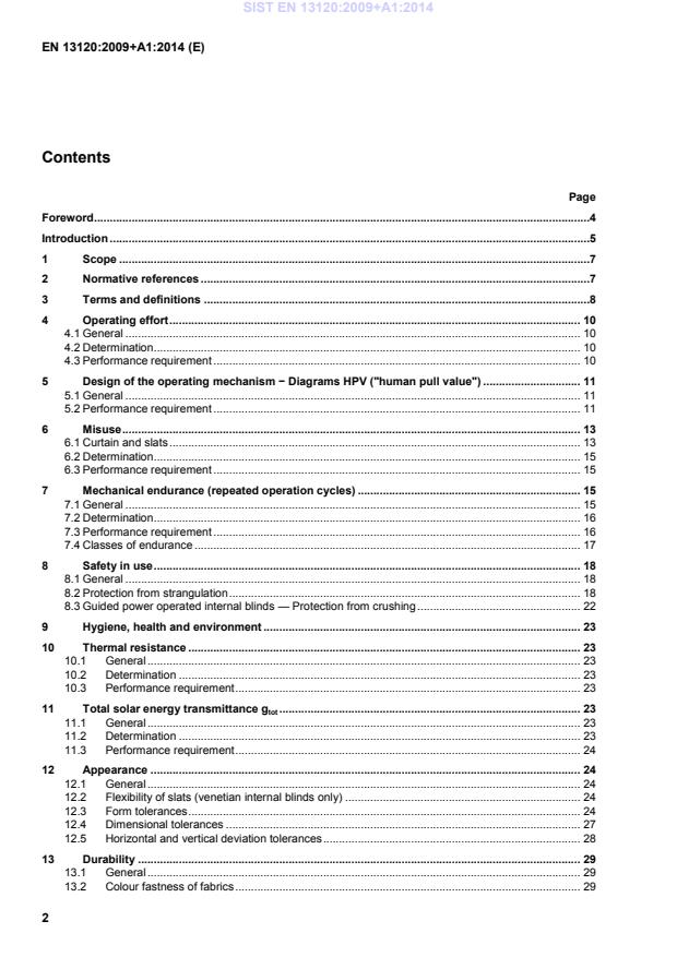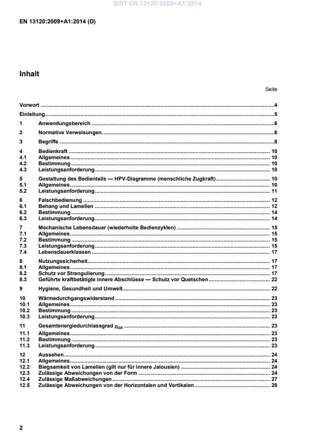 Seite Vorwort .4 Einleitung .5 1 Anwendungsbereich .6 2 Normative Verweisungen .6 3 Begriffe .8 4 Bedienkraft . 10 4.1 Allgemeines . 10 4.2 Bestimmung . 10 4.3 Leistungsanforderung . 10 5 Gestaltung des Bedienteils — HPV-Diagramme (menschliche Zugkraft) . 10 5.1 Allgemeines . 10 5.2 Leistungsanforderung . 11 6 Falschbedienung . 12 6.1 Behang und Lamellen . 12 6.2 Bestimmung . 14 6.3 Leistungsanforderung . 14 7 Mechanische Lebensdauer (wiederholte Bedienzyklen) . 15 7.1 Allgemeines . 15 7.2 Bestimmung . 15 7.3 Leistungsanforderung . 15 7.4 Lebensdauerklassen . 17 8 Nutzungssicherheit. 17 8.1 Allgemeines . 17 8.2 Schutz vor Strangulierung . 17 8.3 Geführte kraftbetätigte innere Abschlüsse — Schutz vor Quetschen . 22 9 Hygiene, Gesundheit und Umwelt. 22 10 Wärmedurchgangswiderstand . 23 10.1 Allgemeines . 23 10.2 Bestimmung . 23 10.3 Leistungsanforderung . 23 11 Gesamtenergiedurchlassgrad gtot . 23 11.1 Allgemeines . 23 11.2 Bestimmung . 23 11.3 Leistungsanforderung . 23 12 Aussehen . 24 12.1 Allgemeines . 24 12.2 Biegsamkeit von Lamellen (gilt nur für innere Jalousien) . 24 12.3 Zulässige Abweichungen von der Form . 24 12.4 Zulässige Maßabweichungen . 27 12.5 Zulässige Abweichungen von der Horizontalen und Vertikalen . 28 SIST EN 13120:2009+A1:2014