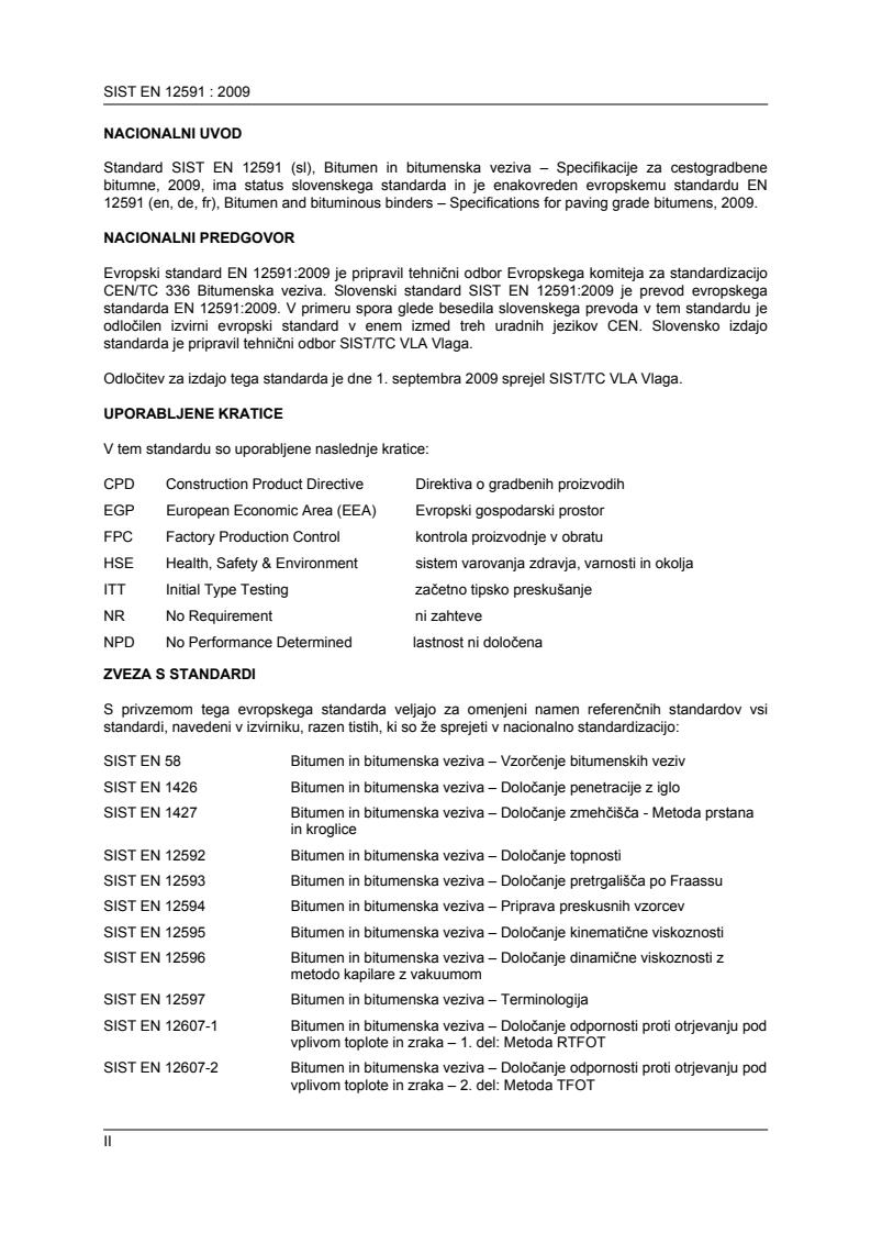 SIST EN 12591:2009 is a standard published by the Slovenian Institute for Standardization (SIST). Its full title is "Bitumen and bituminous binders - Specifications for paving grade bitumens". This standard covers: This European Standard provides a framework for specifying a range of properties and relevant test methods for bitumens, which are suitable for use in the construction and maintenance of roads, airfields and other paved areas, together with requirements for evaluation of conformity. This European Standard does not directly address ‘cohesion, adhesion and setting ability’ (see Introduction). NOTE Although industrial bitumens are specified according to EN 13305, it should be underlined that paving grade bitumens, specified according to this European Standard, can also be used for industrial applications.
