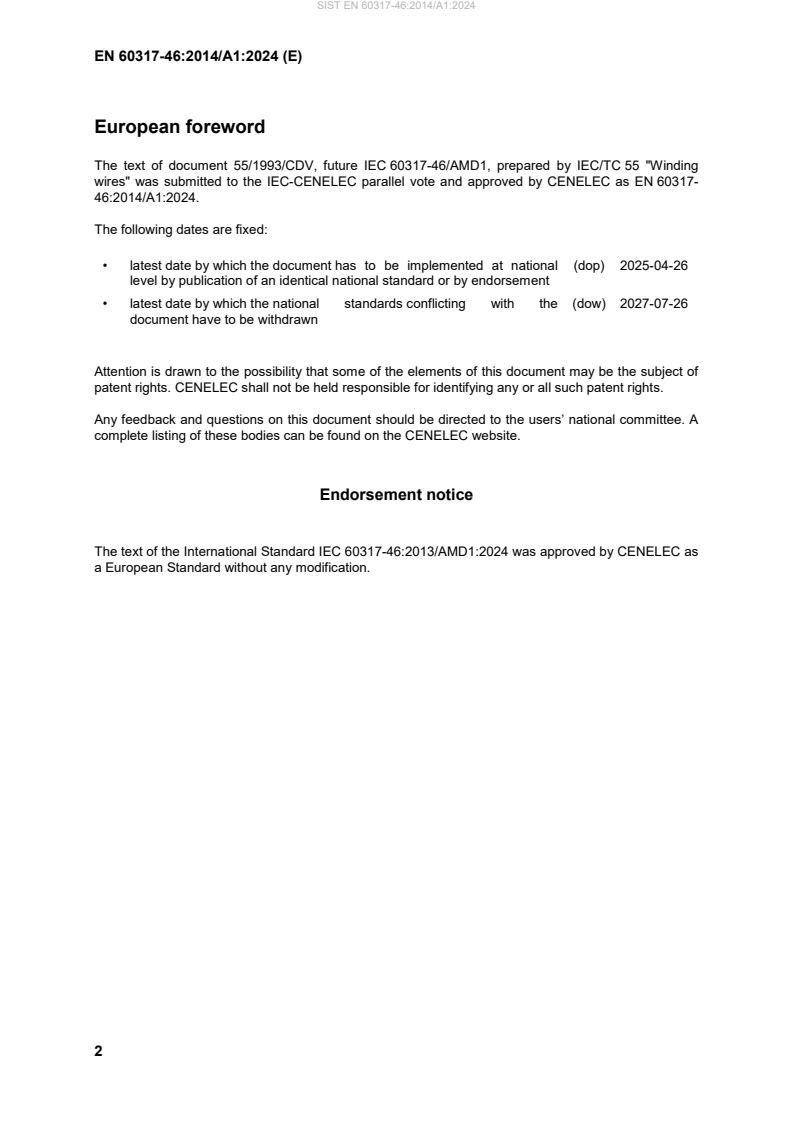This amendment A1 modifies the European Standard EN 60317-46:2014; it was approved by CENELEC on 2024-07-26. CENELEC