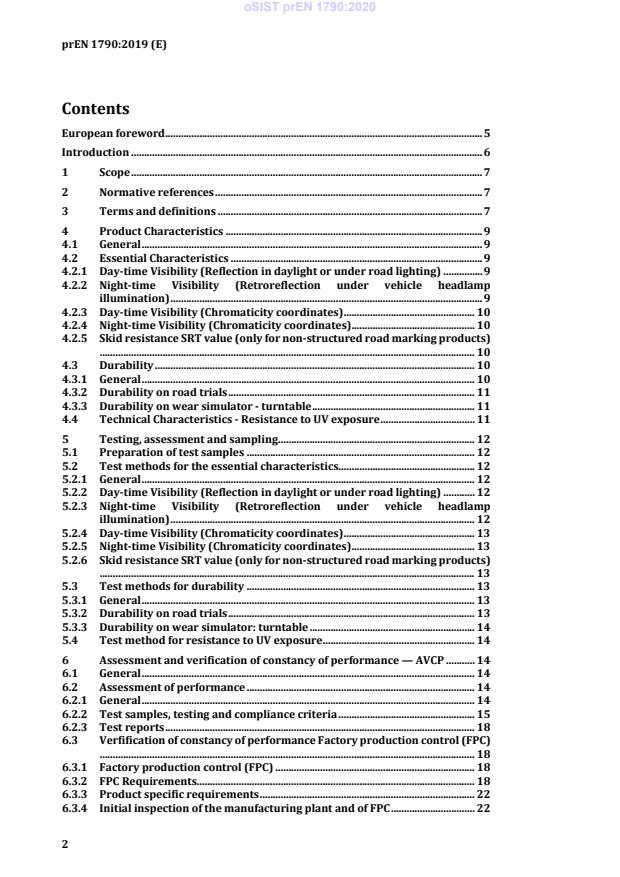 This document specifies the product characteristics, laboratory test methods, the way of expressing results and the relevant procedures for assessment and verification of the constancy of performance, for preformed road markings (namely, marking tapes and preformed markings) of types I and II (structured and non-structured) to be used for permanent road markings, in circulation areas.