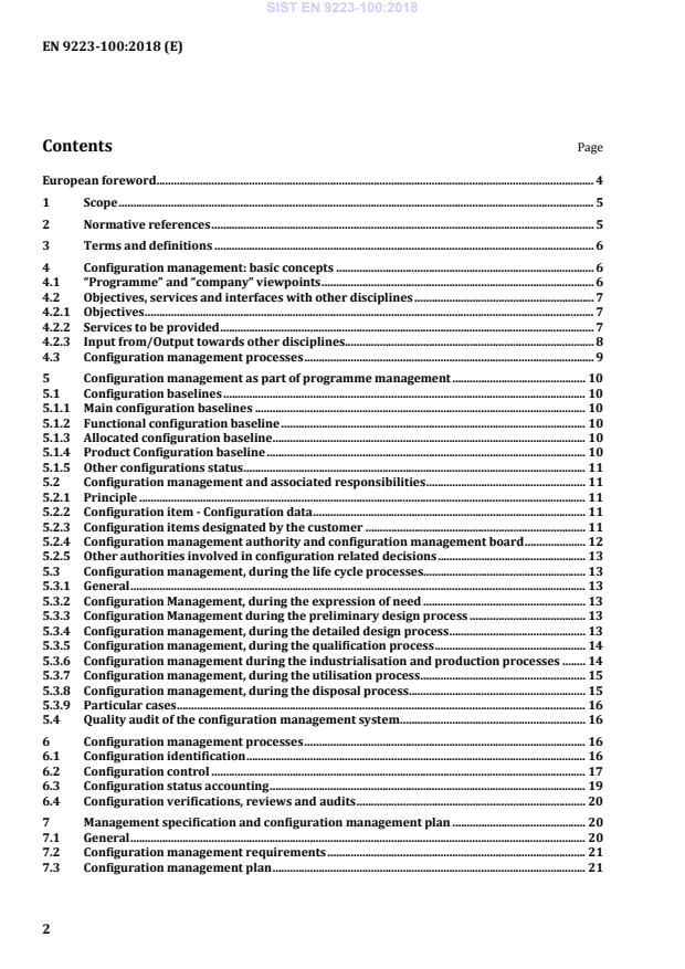 이 문서는 국제적으로 인정받는 개념을 기반으로 하며, "프로그램"과 "회사"의 관점에서 구성 관리에 대한 조직 원칙과 구현 프로세스를 제안한다. 각 프로그램에 대해 필요한 구현 절차와 필요한 조절 작업이 정해져야한다. 이 문서는 구성 관리와 계약 관리 간의 관계에 일부 언급하지만, 계약 관리 절차에 대해서는 다루지 않는다. 항공우주 및 국방 등 복잡한 프로그램에서 사용하기 위한 것으로, ISO 10007 품질 관리 시스템 - 구성 관리 지침과 연장된 문서이다. 이 문서는 EN 9200 프로그램 관리 - 프로젝트 관리 명세 지침과 일치한다. 기술된 원칙들은 프로그램 (당국, 제조업체, 기술 등)의 모든 이해관계자들에게 적용되며, 실현 가능성 단계부터 처분 단계까지의 모든 단계에서 적용 또는 조정될 수 있다. 이 원칙들은 재료 또는 소프트웨어와 같은 모든 제품에 적용이 가능하다.
