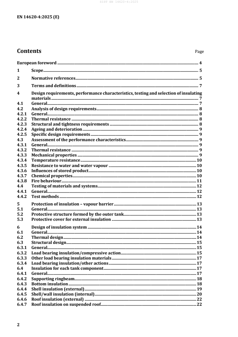 EN 14620-4:2025 - “Design and manufacture of site built, vertical, cylindrical, flat‑bottomed tank systems … Part 4: Insulation components” is the CEN European standard that defines requirements for the materials, design and installation of insulation for refrigerated liquefied gas (RLG) storage tank systems (operating between 0 °C and −196 °C). The document treats thermal insulation as an essential part of RLG tank systems (not ancillary), addressing thermal performance, structural behaviour, vapour barriers and on‑site installation and testing.