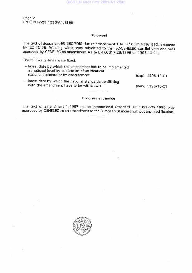 SIST EN 60317-29:2001/A1:2002 is a amendment published by the Slovenian Institute for Standardization (SIST). Its full title is "Specifications for particular types of winding wires -- Part 29: Polyester or polyesterimide overcoated with polyamide-imide enamelled rectangular copper wire, class 200". This standard covers: This amendment 1 is valid for the following parts of the IEC 60317: Part 2 (1990), Part 3 (1990), Part 4 (1990), Part 10 (1972), Part 12 (1990), Part 14 (1990), Part 15 (1990), Part 16 (1990), Part 17 (1990), Part 18 (1990), Part 19 (1990), Part 20 (1990), Part 21 (1990), Part 22 (1990), Part 23 (1990), Part 24 (1990), Part 26 (1990), Part 28 (1990), Part 29 (1990), Part 30 (1990), Part 35 (1992), Part 36 (1992), Part 37 (1992) and Part 38 (1992).