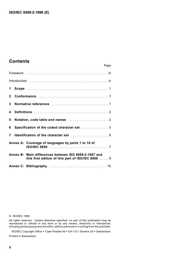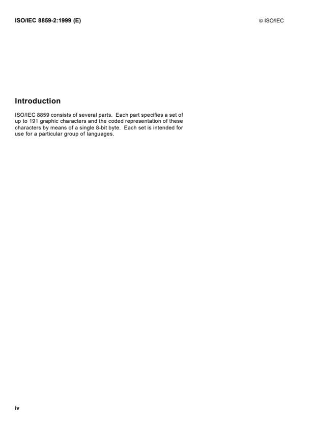 This part of ISO/IEC 8859 specifies a set of 191 coded graphic characters identified as Latin alphabet No. 2. This set of coded graphic characters is intended for use in data and text processing applications and also for information interchange. The set contains graphic characters used for general purpose applications in typical office environments in at least the following languages: Albanian, Croat, Czech, English, German, Hungarian, Latin, Polish, Romanian, Slovak, Slovene and Sorbian. This set of coded graphic characters may be regarded as a version of an 8-bit code according to ISO/IEC 2022 or ISO/IEC 4873 at level 1. This part of ISO/IEC 8859 may not be used in conjunction with any other parts of ISO/IEC 8859. If coded characters from more than one part are to be used together, by means of code extension techniques, the equivalent coded character sets from ISO/IEC 10367 should be used instead within a version of ISO/IEC 4873 at level 2 or level 3. The coded characters in this set may be used in conjunction with coded control functions selected from ISO/IEC 6429. However, control functions are not used to create composite graphic symbols from two or more graphic characters (see clause 6). NOTE ? ISO/IEC 8859 is not intended for use with Telematic services defined by ITU-T. If information coded according to ISO/IEC 8859 is to be transferred to such services, it will have to conform to the requirements of those services at the access-point.